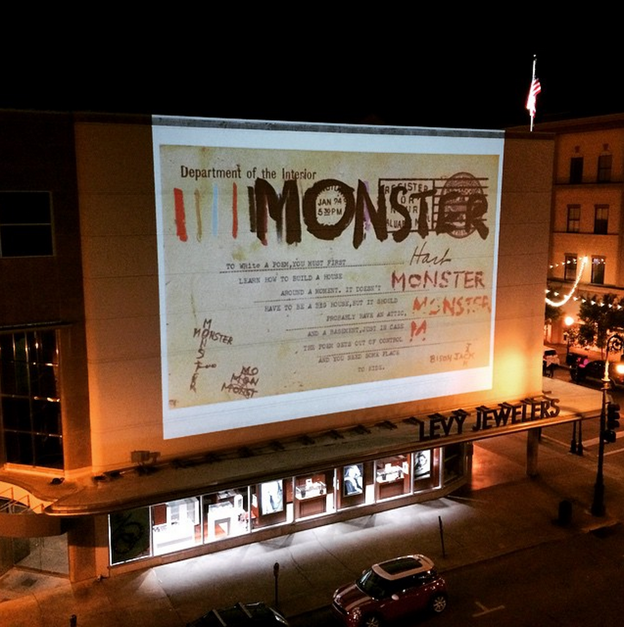 Beck’s installation at the seeSAW exhibit in Savannah, Georgia. His poem “Monster” is splayed on the building wall. (@thejournalofbisonjack/Instagram)